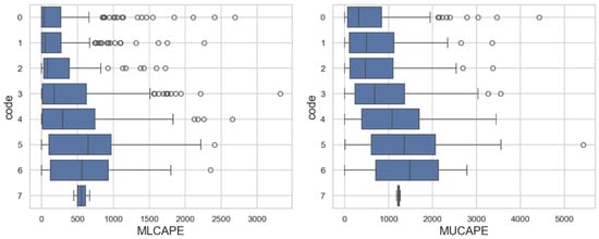 The mean values of the TT index are all nearly 50 °C, indicating that even severe thunderstorms are possible. The highest value of 50.85 °C was recorded on days when the observed hail was sized a pigeon egg (code = 5). CAPE calculated for different air parcels has the highest mean values for code = 5, with the highest value of 5433.2 J kg−1 for MUCAPE. The lowest mean absolute value of convective inhibition (CIN, CINv) in an absolute sense is for walnut-sized hailstones (code = 6). BRN has the highest mean value for code = 0, and BI for code = 6 (96.84). The HI has the lowest mean value for code = 2 (23.51 °C). BSHR06 mean values increase as the hail size increases; the largest value is 20.41 m s−1 for code = 6. Its largest value of 21.8 m s−1 is for one of two days with a reported gigantic hailstone of code.