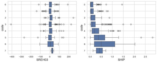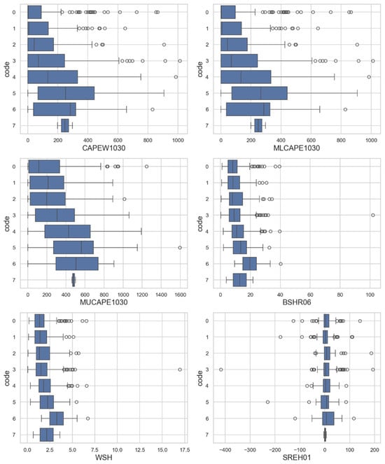 Figure 2 illustrates the evaluation of various stability indices across different hail sizes. There is considerable overlap among the smallest hail sizes (codes 0 to 3) for BSHR06 and WSH. Storm Relative Helicity (SREH) utilises storm-relative environmental winds to calculate a relative horizontal helicity contribution, which is useful for forecasting mesocyclones. SREH01 and SREH06 show overlap across all hail sizes: there is little if any index value spacing among all hail sizes. Instability within the hail growth zone and the region typically nearly below can be explored by analysing CAPE1030, MUCAPE1030, and MLCAPE1030. These indices exhibit a tendency to occupy different parameter spaces as hail size increases, suggesting that they could be effective in distinguishing between hail sizes. One of the newer indices that incorporates multiple factors favourable for hail formation—such as humidity, instability, and wind shear—is the Significant Hail Parameter (SHIP). Its values range from 0 to 4. If the pre-storm environment has a SHIP value greater than 1, there is a possibility of significant hailstones with diameters larger than 5 cm forming. Additionally, SHIP effectively differentiates between larger and smaller sizes of hail, as evidenced by the varying values depicted for different hailstone sizes in Figure 1.