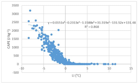 Scatter plots can quickly highlight intriguing patterns within the data. The relationship observed between CAPE and LI during the three summer months (June, July, and August) in the analysed period follows a fifth-degree polynomial (see Figure 3). The coefficient of determination is notably high, with an R2 value of 0.868. It shows how well a model fits the data and indicates the proportion of variance in the dependent variable that the model explains. When the LI is greater than zero, CAPE tends to remain close to zero. However, as LI values drop below zero, CAPE increases rapidly.