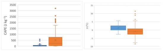 Box and whiskers plots of daily values of CAPE (J kg−1) and LI (°C) for hail days for April (blue) and June (orange) during 2005–2020.