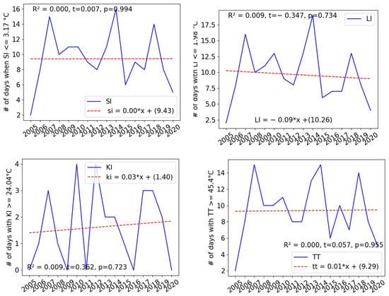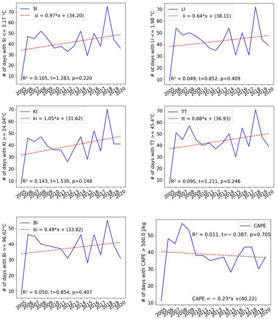 Number of hail days with fulfilled conditions regarding stability indices thresholds with belonging linear regressions from 2005 to 2020. R2, t, and p are the coefficient of determination, t-statistic, and p-value, respectively.