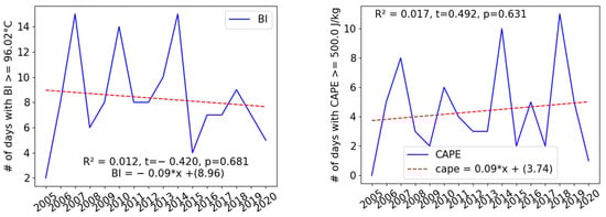 To determine whether the frequency of occurrence of days with stability index values above the threshold for the Belgrade area has changed, we performed a linear regression analysis of the number of these days from 2005 to 2020. Although a threshold for CAPE has not been established for the Belgrade area, we calculated a linear regression for the number of hail days when the CAPE value exceeded 500 J kg⁻1, indicating strong convective activity [16]. The results are shown in Figure 5. There is an increase in KI, TT, and BI, from which it can be concluded that the atmosphere is more favourable for the formation of thunderstorms. The opposite is true for the indices whose lower values indicate a higher probability of thunderstorm formation (SI, LI, and CAPE), which increase. However, this increase/decrease is not statistically significant for any of these indices. That confirms the p-value and t-statistic, which are shown in Figure 4. Based on the available data, no recognisable trends could be identified for the indices. Furthermore, the Mann–Kendall test was conducted on these data, revealing the absence of monotonic trends.