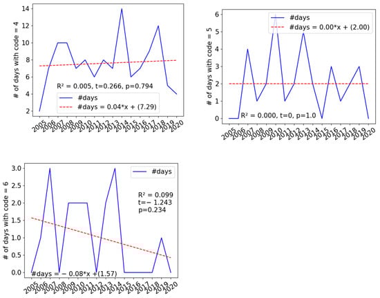 Number of hail days when codes four, five, and six were reported from 2005 to 2020. Corresponding linear regressions are also shown. R2, t, and p are the coefficient of determination, t-statistic, and p-value, respectively.