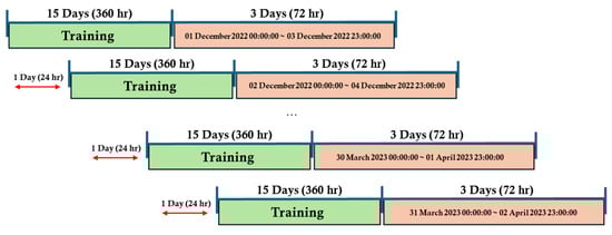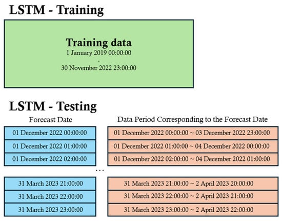 The training period for the LSTM model spans approximately four years, from 1 January 2019 to 30 November 2022, while the evaluation period corresponds to the fourth phase of the Seasonal PM Management (1 December 2022–31 March 2023). The LSTM model is structured to utilize three days of chemical transport model forecast data as input to predict the same three-day forecast period (Figure 2).