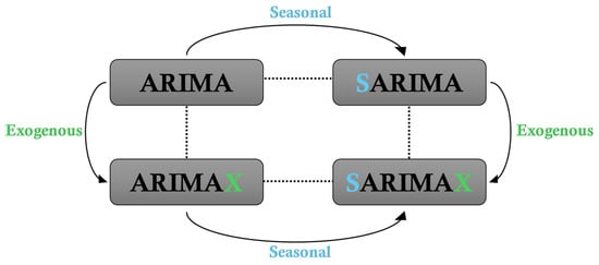 ARIMA models are categorized based on the presence of seasonality (Seasonal) and exogenous variables (Exogenous), as illustrated in Figure 3. The SARIMAX model, which is employed in this study, extends ARIMA by incorporating both seasonal and exogenous components, enhancing its predictive capability for complex time series data.