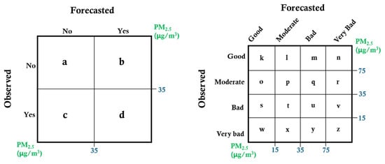 Figure 5 presents a matrix comparing observed and forecasted PM2.5 concentrations based on a threshold of 35 μg/m3. The concentration levels are further classified into four categories—Good, Moderate, Bad, and Very Bad—using thresholds of 15 μg/m3, 35 μg/m3, and 75 μg/m3. The results are analyzed based on these classifications.