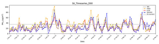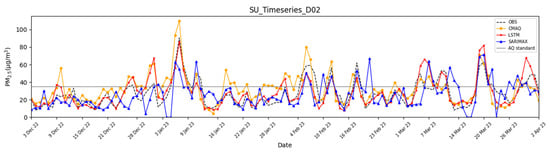 The results of the hourly high PM2.5 concentration analysis exhibited comparable statistical results and trends to the daily average analysis. As the forecast lead time increased, the LSTM model showed an improved predictive performance, while SARIMAX demonstrated superior accuracy at the shortest lead time (D00). However, the statistical performance of the hourly analysis was not in agreement with the observations data compared with daily-scale analysis. This discrepancy may be attributed to the fact that daily data tend to smooth out high-frequency fluctuations in PM2.5 concentrations, thereby compensating for the model’s limited ability to capture abrupt, short-term variations in PM2.5 concentration (Table 5).