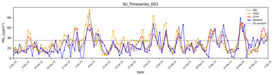 Examining the temporal patterns shows that SARIMAX closely replicated high and low concentrations in D00, aligning well with the observed concentrations. However, on 2 January 2023, it tended to underestimate concentrations compared to measurements, exhibiting negative bias. This tendency became more frequent as the forecast progressed to D01 and D02, suggesting that the derived multi-variable equation approach contributes to long-term forecasting issues. Consequently, as the prediction advanced to D01 and D02, SARIMAX struggled to accurately capture the time series patterns of the observed concentrations. As such, SARIMAX exhibited tendencies to overestimate and underestimate under high- and low-concentration conditions, respectively. This can be interpreted as a limitation of its linear-based structure, which fails to capture nonlinear and abrupt changes in the data.