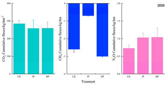 In 2020, the cumulative CO2 flux under a precipitation treatment was 284.76 (CK), 258.38 (IP), and 259.61 kg·hm−2, with contributions to global warming potential of 100.66%, 99.87%, and 100.76%, respectively. In 2021, it was 224.68 (CK), 184.46 (IP), and 182.32 kg·hm−2, with contributions of 99.08%, 102.12%, and 100.27%, respectively (Figure 8). The contribution rate of CO2 flux to the global warming potential under the precipitation treatment was lower than that in natural conditions, indicating that the inhibition of the greenhouse effect by an extreme precipitation increase in the region is greater than that by an extreme precipitation decrease, so the “warm and moisturizing” of the Qinghai–Tibet Plateau may play a positive feedback role on CO2 emissions in the river source wetland. The cumulative CH4 flux under the precipitation treatment was −2.6 (CK), −0.7 (IP), and −3.0 kg·hm−2, with contributions to the global warming potential of −0.92%, −0.27%, and 0.40%, respectively. In 2021, it was 0.9 (CK), −1.6 (IP), and −0.9 kg·hm−2, with contributions of 0.40%, −0.89%, and −0.49%, respectively. The CH4 flux in the Wafangshan River source wetland was in a “sink” state both in natural conditions and under the precipitation treatment, and the increase in water did not cause an increase in CH4 flux emissions, but the CH4 flux went from a “sink” to a “weak sink”, indicating that the increase in water, to some extent, inhibited the absorption of methane. The cumulative N2O flux under the precipitation treatment was as follows: 0.73 (CK), 1.03 (IP), and 1.04 (DP) kg·hm−2, with the respective contributions to the global warming potential being 0.26%, 0.40%, and 0.40%. In 2021, the cumulative N2O flux was as follows: 1.19 (CK), −2.23 (IP), and 0.41 (DP) kg·hm−2, with respective contributions of 0.52%, −1.23%, and 0.23%. Extreme water reduction caused the wetland soil to become acidic, and the acidic soil, to some extent, promoted the emission of N2O.