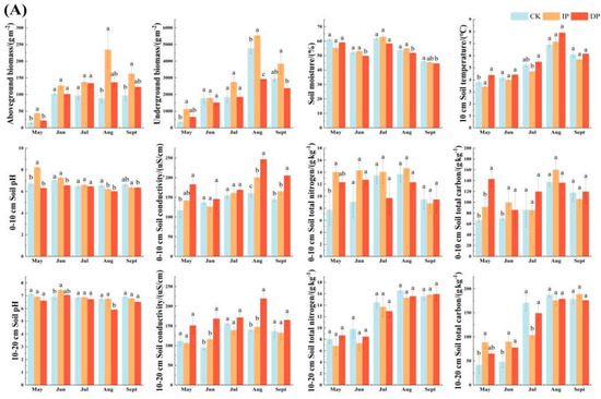 During the 2020 growing season, the precipitation simulator did not cause any significant change in soil moisture in the IP sample plot, but it reduced the soil moisture in the DP sample plot by 4.72%. While the soil temperature decreased by 0.3 °C in the IP sample plot, it increased by 0.3 °C in the DP sample plot (Figure 4).