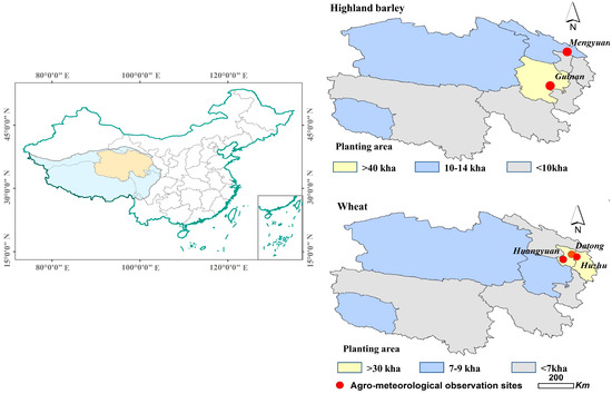 As shown in Table 1, field trials of HB were carried out at two agro-meteorological observation stations situated in Guinan County and Menyuan Hui Autonomous County. These locations are major HB planting areas in the Hainan Tibetan Autonomous Prefecture and Haibei Tibetan Autonomous Prefecture, respectively. Field trials of wheat were conducted at three agro-meteorological observation stations located in Datong Hui and Tu Autonomous County, Huzhu Tu Autonomous County, and Huangyuan County. These locations are important wheat planting areas in Xining City, Haidong City, and Xining City, respectively. In total, these trials were conducted at five agro-meteorological observation stations in Qinghai Province (see Figure 1), all under the auspices of the Chinese Meteorological Administration (CMA). Soil information, crop varieties, and management data—phenological, observed data for field trials—were gathered from the agricultural meteorological station. Soil information included saturated water content, wilting coefficient, and field water holding capacity. Phenological, observed data covered key stages such as planting, emergence, three-leaf stage, tillering, jointing, boot, heading, anthesis, milk, and maturity dates.
