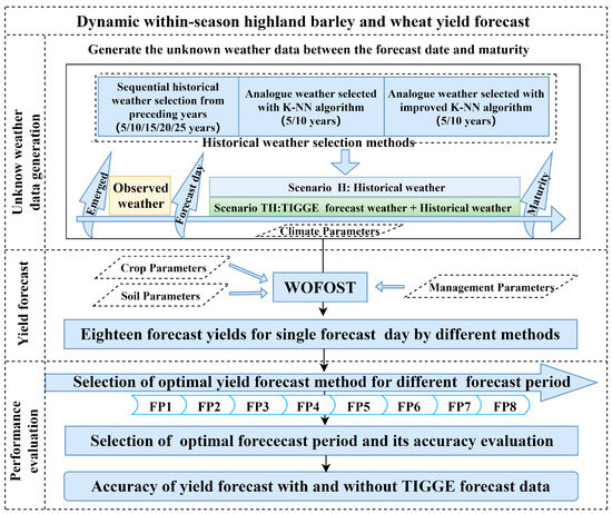 Despite this approach, addressing two challenging steps is necessary for its effective application. The first is selecting historical weather data that closely matches the current year’s climate conditions. The second is determining the forecast periods from emergence to maturity, which can be used to forecast crop yields that best match the observed yields. To tackle these challenges, we divided the growth period into distinct stages based on observed phenological data and tested three weather data fusion methods: sequential historical weather selection from preceding years, a KNN-based analogue weather selection, and an improved KNN-based analogue weather selection to choose historical weather data for each forecast period. By identifying the optimal forecast period based on the most effective method, we tested two hypotheses. The first hypothesis is that different historical weather selection methods are needed for different forecast periods. The second hypothesis is that the accuracy of the crop yield forecast gradually improves, with more observed weather data becoming available as the forecast period progresses. Various types of seasonal forecasts have been utilized for crop yield forecasting, including General/Regional Circulation Models (GCM/RCM)-based forecasts, forecasts based on phases of the El Niño Southern Oscillation (ENSO) and Southern Oscillation Index (SOI), empirically derived forecasts, and forecasts based on analogue years [18,19,20,21,22,23]. Recently, researchers have focused on combining forecast and historical data to address unknown future weather data [5,24,25,26]. The question of whether using forecast data can enhance the accuracy of HB and wheat yield forecasting in Qinghai remains unanswered. To answer the question, we integrate THORPEX Interactive Grand Global Ensemble (TIGGE) short-term forecast data with historical weather data for crop yield forecasting. Additionally, we tested a third hypothesis: the incorporation of TIGGE short-term forecast data will significantly increase crop yield forecast accuracy.