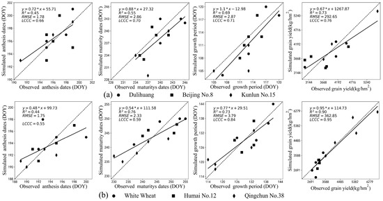 Comparison of WOFOST-simulated and observed dates of anthesis and maturity, length of growth period, and grain yield for highland barley (a) and wheat (b) cultivars. Note: “*” indicates multiplication.