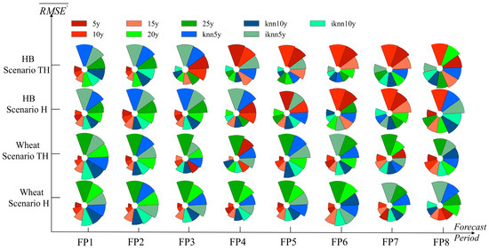 We assessed the accuracy of yield forecasts for HB and wheat across eight forecast periods (FP1-FP8) using various weather data fusion methods (Figure 4). Different methods proved most suitable for distinct growth stages. Under scenario TH, the optimal methods for HB were 5y, 5y, IKNN10, IKNN10, IKNN10, IKNN5, IKNN5, and IKNN5 for FP1-FP8, respectively. Similarly, the optimal methods for wheat were 5y, 5y, 15y, 15y, 5y, 10y, 10y, and 5y for FP1-FP8, respectively. Under scenario H, the optimal methods for HB were 10y, 5y, 10y, 20y, 20y, KNN10, IKNN10, and 5y for FP1-FP8, respectively. For wheat, the optimal methods were 5y, 5y, 5y, 10y, 5y, 10y, 10y, and IKNN10y for FP1-FP8, respectively. Significant differences were observed among the nine weather data fusion methods used in FP1-FP6, but these differences were less pronounced in FP7 and FP8 than in FP1-FP6. Overall, sequential-based selection and improved KNN algorithm-based selection were more suitable for HB, with these two methods being optimal in 8 and 7 of 16 forecast periods, respectively. For wheat, sequential-based selection was more suitable, with this method being optimal in 15 out of the 16 forecast periods.