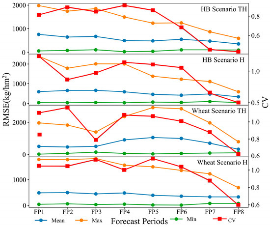 RMSE values between observed and simulated yield were calculated for each forecast period to identify the optimal forecast period (Figure 5). The results showed that the minimum overall RMSE value was less than 145.1 kg/ha for both HB and wheat. Under scenario TH, the maximum and mean RMSE values for wheat increased and then decreased in later forecast periods, reaching their peak at FP5. For wheat under scenario H and for HB under scenarios H and TH, maximum and mean RMSE values exhibited an overall decreasing trend with increasing forecast periods. CV for both HB and wheat declined as growth stages progressed under both scenarios, indicating an increase in yield forecast accuracy with the development of the forecast period. Overall, optimal yield forecast periods were FP7 and FP8. Maximum RMSE values for these two periods were found to be 869.4 kg/ha and 589.52 kg/ha, respectively (scenario TH of HB), 1109.1 kg/ha and 588.99 kg/ha (Scenario H of HB), 1969.068 kg/ha and 791.47 kg/ha (Scenario TH of wheat), and 1230.6 kg/ha and 690.65 kg/ha (Scenario H of wheat). The corresponding CV values were 0.45 and 0.43, respectively (Scenario TH of HB), 0.65 and 0.5 (Scenario H of HB), 0.88 and 0.62 (Scenario TH of wheat), and 0.88 and 0.6 (Scenario H of wheat).