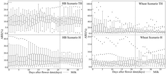 Additional analysis focused on day-to-day accuracy changes within the optimal forecast periods using ARE performance (Figure 6). These periods ranged from flowering to maturity, including FP7 and FP8. For HB, upper quartile values ranged from 12.07% to 18.84% and 11.35% to 19.06%, with medians ranging from 9.14% to 13.71% and 6.77% to 12.6% under scenarios TH and H, respectively. For wheat, upper quartile values concentrated in the ranges of 8.06–41.22% and 5.95–10.44% under scenarios TH and H, respectively, with medians in ranges of 3.89–12.12% and 2.44–8.09%, respectively. The box lengths showed a decreasing trend for HB under both scenarios, similar to wheat under TH, indicating a more concentrated ARE distribution. Specifically, the box lengths for HB under scenario H and for wheat under scenario TH showed a significant decreasing trend. However, the box lengths for wheat under scenario TH exhibited considerable fluctuation without a clear trend. Overall, the yield forecast for HB performed better under scenario TH, while the yield forecasts for wheat performed better under scenario H. The best performance for both HB and wheat occurred in later growth stages under scenarios H and TH, respectively. Additionally, uncertainties in the yield forecasts for both HB and wheat under scenario TH declined as the forecast days approached maturity.