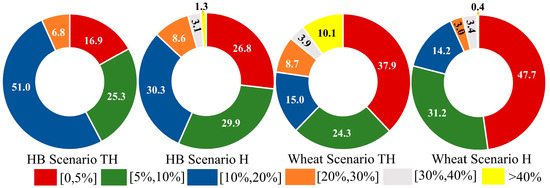 Probability distributions of absolute relative error (ARE). (Note: Every pie chart section represents the probability proportion of the average ARE during the optimal forecast periods falling within different numerical intervals. Scenarios TH and H refer to yield forecast with and without TIGGE, respectively. HB is highland barley. Percentages are rounded to one decimal place; the total may not equal exactly 100%).