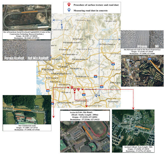 To verify the hypothesis regarding road dust emissions, experiments were conducted at the Yeoncheon Social Overhead Capital (SOC) Center of the Construction Technology Research Institute (Site A) in South Korea, focusing on PP and Hot Mix Asphalt (HMA). Additionally, data on road-suspended dust were collected for HMA, asphalt grooving (horizontal), and asphalt grooving (longitudinal) pavements at the Yeoju test road on the Korea Expressway (Site B). Furthermore, to gather various data on HMA, which is commonly used in South Korea, as well as the characteristics of tire-surface suspended dust and dust emissions, measurements were taken for the three types of asphalt HMA applied in Yongin City. Generally, the longitudinal grooving shape is not used in asphalt pavements; this section was installed specifically for testing to investigate the relationship between road surface texture and suspended dust.