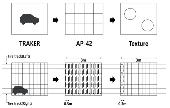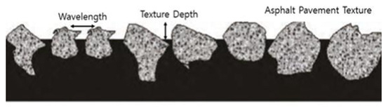 In general, the road surface structure of asphalt pavement is characterized by both microtexture (texture depth) and macrotexture (wavelength) [12,13]. Due to the irregular placement of aggregates, both texture depth and wavelength vary at each measurement point. This is described in Figure 2. Therefore, it is crucial to collect diverse data [13]. In the case of concrete pavements, the shape of coarse aggregates plays a significant role in determining the microtexture of the road surface, while other factors primarily contribute to the formation of the macrotexture [12]. Asphalt pavement, in particular, exhibits irregularities on the road surface with random wavelengths and texture depths, which may lead to dust being suspended in the air by wind or vehicle traffic [17]. Vehicle traffic generates air pumping with wind speeds of 2.2 m/s at 50 km/h [6]. Consequently, road texture is composed of both wavelength and texture depth, which are expressed as microtexture and macrotexture. It is known that pavements with rough textures exhibit the highest friction coefficient, providing the best friction for expected braking forces. Furthermore, in relation to road texture depth, various road texture wavelengths are quantified, as they occur within a single section of road pavement. The number of inflection points according to the road texture wavelength is defined as the Peak Number (PN) [18,19].