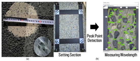 The method of measuring the wavelength is evaluated through aggregate exposure using the Exposed Aggregate Number (EAN), which is calculated with specialized equipment and software. The measurement apparatus captures superimposed images, which are then reconstructed into a three-dimensional surface texture, allowing the aggregate exposure to be visualized, as shown in Figure 3b. For each section, a 100 cm × 60 cm area is divided into 24 segments, and photos are automatically taken using a program installed on a laptop [19]. Through this process, the wavelength of the road surface is determined by measuring the aggregate exposure in the designated pavement sections. To calculate the average distance between aggregates, a 5 mm width of the road surface is measured, and the peak points of the aggregates are identified over a 300 mm length [18].