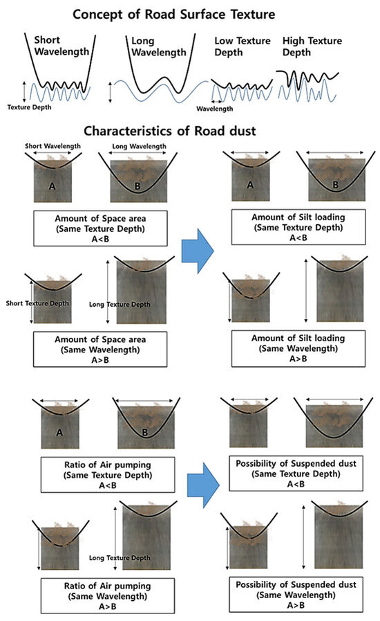 The emission of dust particles resulting from tire and brake wear is retained within the surface texture and subsequently deposited onto the pavement. This retention of dust and contaminants is predominantly influenced by traffic-induced turbulence, with particles being captured within the surface texture. Traffic turbulence refers to the airflow generated as a vehicle moves, facilitating the interaction between the tires and the road surface. The texture of the road surface plays a critical role in tire–pavement interaction, deviating from a uniformly smooth surface. The characteristics of the road texture, along with the dust generation mechanisms, are governed by both the wavelength and texture depth of the surface, which are determined by the specific attributes of the texture. The hypothesis related to surface texture explored in this study is illustrated in Figure 4.