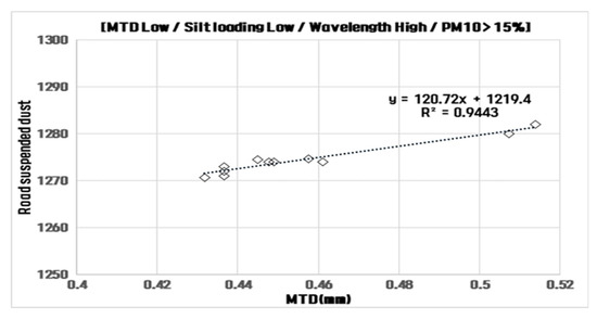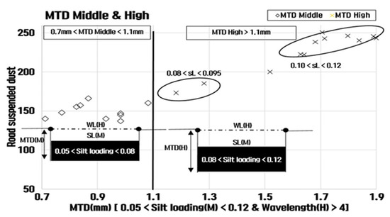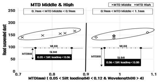 To quantify the concentration of suspended dust in relation to texture characteristics, the variation in suspended dust concentration across different grades was analyzed, as presented in Table 4. By identifying the suspended dust concentration based on these influencing factors, the relationship between macrotexture depth (MTD) and suspended dust was quantified. MTD management strategies for controlling suspended dust were proposed, assuming a constant dust concentration for a given MTD. The analysis categorized MTD values into high, middle, and low groups to assess the impact of road texture on suspended dust. Thus, the change in suspended dust concentration generated according to each grade was analyzed by classifying MTD into high, middle, and low categories. As shown in Table 4, MTD values were classified as low (≤0.7 mm), middle (0.7–1.1 mm), and high (≥1.1 mm). For sL, the high and middle dust loads were classified using urban roads and 1 g/m2 in Incheon, based on a threshold of 0.05 g/m2 in accordance with the dust load levels observed in city center areas [25].