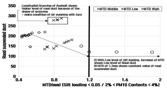 However, once the MTD reached 1.2 mm, the concentration of suspended dust remained constant, suggesting that a texture depth of 1.2 mm or more is sufficient to maintain suspended dust at a stable level during tire–road contact. As the MTD increased, the concentration of road-suspended dust tended to decrease. At this time, depending on the type of pavement, HMA, asphalt grooving, and PP appeared lower than the MTD value presented above, the higher the suspended dust concentration, and in the case of PP, the suspended dust concentration was relatively low due to the voids [28,29]. So, the concentration of dust in the asphalt section is judged to have a statistically clear correlation. The suspended dust generation mechanism according to this road surface organization is judged to cause tire deformation on the road surface momentarily as the tires rotate with the peak level existing on the road surface, resulting in suspended dust caused by the tires. Therefore, in the case of the same pavement conditions, the higher the peak level of the MTD, the more dust can be suspended on the road surface, increasing the dust concentration. Since the peak level of the road surface texture increases as the MTD increases, it is judged that management is necessary to reduce dust of suspension.
