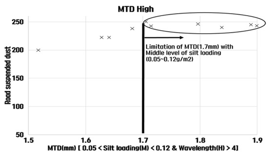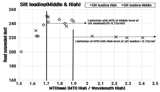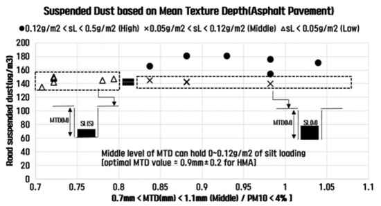 At the highest level of MTD, exceeding 1.7 mm, the concentration of road-suspended dust remained constant regardless of further increases in MTD values. This suggests that an MTD depth of 1.7 mm is sufficient to prevent dust from becoming airborne, even when the sL is at a middle level. The deep texture created by an MTD greater than 1.7 mm effectively traps dust particles on the surface, limiting their suspension in the air. Therefore, managing road-suspended dust in areas with a high sL can be achieved by optimizing MTD, using a deeper texture depth to reduce the release of suspended dust. Furthermore, with respect to sL, an MTD of 1.7 mm was found to effectively manage middle-level sL values, while an MTD of 1.9 mm was capable of accommodating higher sL values, up to 0.12 g/m2. Although the measurement value of sL remained below 0.2 g/m2, it did not reach the highest threshold of sL. Nevertheless, these results suggest that increasing MTD can serve as an effective method for suppressing the suspension of road dust in the air, providing a practical approach for managing road dust emissions by controlling the texture depth (Figure 14).