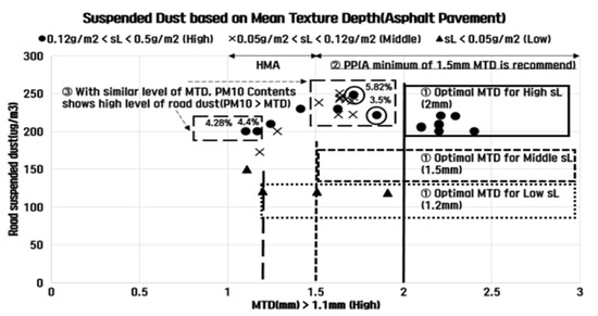 - Threshold for Dust Control: When the MTD exceeds 1.7 mm, the suspended dust concentration stabilizes, suggesting that a deeper macrotexture can help contain dust particles and prevent their release into the air. With the level of sL, the limitation with an MTD of 1.7 mm can hold the sL of middle level and a 1.9 mm MTD can show the high level of sL of 0.12 g/m2. An optimal MTD in terms of suspended dust, and 1.2 mm in the lower sL section, 1.5 mm in the middle section, and 2 mm in the high section were measured as the section where road-suspended dust remained constant. At this time, since the section where the MTD is elevated appeared as a porous paving of asphalt pavement, it is judged that an MTD value of at least 1.5 mm is required for road dust management.
