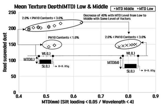 This is caused by contact with the peak level of the road surface during the rotation of the tires, which enhances the dust suspension process. Moreover, the results indicated that the higher the MTD, the greater the amount of sL. In sections where the MTD was lower, it was found that as the MTD increased, the suspended dust concentration also increased, which is consistent with the findings shown in Figure 19. This suggests that the texture depth (MTD) plays a crucial role in the generation of suspended dust, particularly when considering the interaction between the road surface texture, tire contact, and dust load. Therefore, managing the MTD and wavelength is important for controlling road dust emissions, especially in areas with high PM10 content.