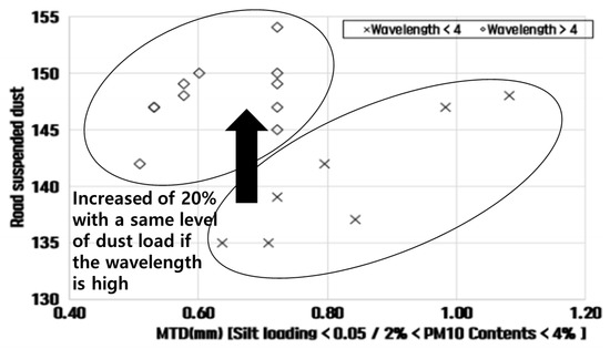 However, capturing the exact relationship between suspended dust caused by air pumping and MTD remains challenging. Despite this, evaluating the relationship between suspended dust and wavelength based on the rating of MTD and sL provides valuable insight into how surface texture and road conditions affect dust suspension. This underscores the need for further research to understand the nuanced interactions between these factors and their role in road dust management. However, when the sL value shows a high dust load, minimizing the wavelength is crucial for reducing the suspended dust concentration (Figure 15). This highlights the importance of controlling the surface texture to manage road dust, supporting the relationship between surface texture and road noise [7,13]. By minimizing the gap between aggregates, the peak level can be reduced, thus minimizing the wavelength of asphalt pavement. This method could effectively help manage suspended dust in areas with a high dust load, such as industrial zones.