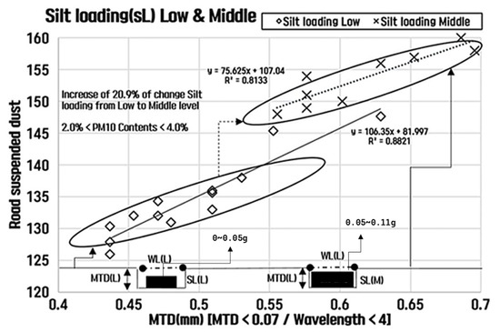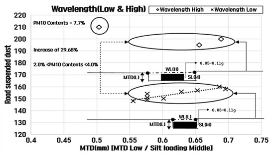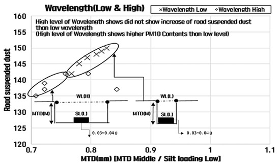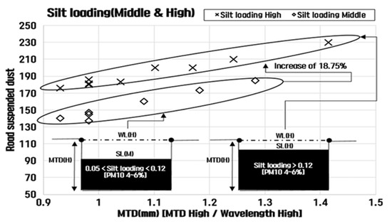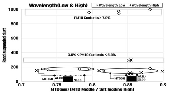 Therefore, it is observed that the gap between aggregates increases with a longer wavelength [18], which creates more space for dust particles to become suspended in the air. This suggests that the wavelength has a significant effect on the concentration of suspended dust. Additionally, as a result of analyzing suspended dust according to both the high sL and high wavelength within the same MTD level, it was found that higher sL values correspond to a 20% increase in suspended dust concentration. This increase in dust concentration is believed to be influenced by the higher sL, which in turn affects the dust levels, despite maintaining similar PM10 content across the measurements. This reinforces the relationship between sL, wavelength, and the concentration of suspended dust, highlighting their combined impact on road dust emissions (Figure 21).