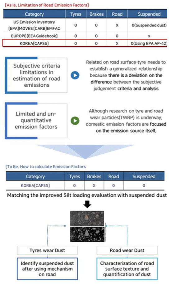 - Yoo, H.; Cho, J.; Hong, S.; Kim, I. Characteristics of suspended road dust according to vehicle driving patterns in an urban area and PM10 content in silt. Atmosphere 2024, 15, 5. [Google Scholar] [CrossRef]