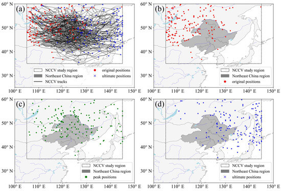 The NCCV process during the warm season (May to September) from 2012 to 2022: (a) activity tracks (black solid lines); (b) original positions (red dots); (c) peak positions (green dots); (d) ultimate positions (blue crosses) across the study region (35–60° N, 105–145° E).