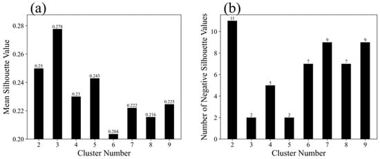 The K-means clustering method cannot independently determine the optimal cluster number (K value). Therefore, the K value is typically obtained by comparing the difference between the mean silhouette value and the number of negative silhouette values across different clustering results. The silhouette value reflects the intra-cluster cohesion and inter-cluster dispersion of sample i, which can be calculated using the following equation: