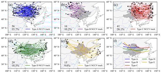 Figure 4a–e illustrates the five typical NCCV tracks, with types A, C, and D occurring more frequently. The dominant type A NCCVs (eastward-moving dissipative; Figure 4a), accounting for 35.7%, occurred near Lake Baikal and eastern Mongolia, moving eastward and ultimately dissipating near the coastline. Often retrogressing westward after moving east, type B (eastward-moving retrogressive; Figure 4b), accounted for 10%. Distinct from types A and B, type C (short-range eastward-moving offshore; Figure 4c) primarily formed in central and eastern Northeast China and moved eastward toward the sea, accounting for approximately 26%. Type D (long-range eastward-moving offshore; Figure 4d), accounting for 18.5%, originated in eastern Mongolia and moved eastward into the sea along a longer track. The long-range southeastward-moving offshore type E (Figure 4e) covered nearly the whole study region. Figure 4f highlights the differences between the five types of NCCV tracks in terms of activity region, track length, shape, and movement direction. The average track of type E (yellow line) had the longest length and a distinct southeastward swerve, while that of type B (purple line) showed the shortest length, an abrupt retreat, and the northernmost location. Although types A (blue line) and C (red line) had similar latitudinal tracks, the longitude ranges differed obviously. Type D (green line) exhibited a relatively straight movement direction, as did types A and C, although it was longer in length. The classification results in this study show a more refined division compared to the four-category classification of June NCCVs by Fang et al. [37]. While the results show some similarities, particularly for types B, C, and E, their category 1 was more precisely subdivided into types A and D, each with distinct characteristics than in our classification. This improvement can be attributed to the optimization of parameters. Furthermore, the reason for the reduction in the number of classifications in July and August [38] will also be discussed in the subsequent section on the inter-monthly variations of NCCV tracks.