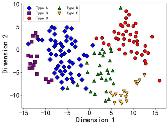 T-SNE (t-Distributed Stochastic Neighbor Embedding) [41] is a nonlinear dimensionality reduction algorithm that simplifies the data complexity while preserving local features, thereby quantitatively assessing the clustering performance [37]. This algorithm was applied to reduce the clustered NCCV track data, described by eight feature parameters, into a two-dimensional diagram for visualization (Figure 5). The x- and y-axes do not represent specific physical or temporal parameters but instead correspond to the projections of the original NCCV track data onto two principal components identified by t-SNE. These components capture the most significant variations in the data, with similar NCCV tracks placed closer together and dissimilar tracks positioned farther apart. The clustering results indicated that the data within the five clusters were well-separated and tightly grouped, demonstrating effective clustering. Although a few outliers may not be perfectly classified, they did not affect the overall clustering results.