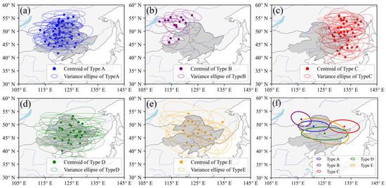 The centroid and variance ellipse (Figure 6) can effectively capture the key characteristics of the NCCV track, including the average position, track length, shape, activity range, and movement direction. The long axis of the variance ellipse represents the meridional variance, the short axis represents the zonal variance, and the tilt angle reflects the diagonal variance. The centroids of type A (Figure 6a) were primarily located in the central and western parts of Northeast China, with the variance ellipses oriented from west to east. These ellipses were the flattest, exhibiting the strongest directional orientation. Those of type B (Figure 6b) were located in the western part of Northeast China, with smaller and more circular variance ellipses. This suggested that the type B NCCVs exhibited a smaller activity range, and their positions varied more uniformly in both the meridional and zonal directions. For type C (Figure 6c), the centroids were also primarily located on the opposite side compared to type B. The variance ellipses covered the eastern coastal region, oriented primarily from west to east. The centroids of type D (Figure 6d) were mainly located in central Northeast China, with variance ellipses covering the whole Northeast China and oriented from west to east. The average centroid of type E (Figure 6f) was similar to that of type C. However, the average variance ellipse of type E exhibited a larger rotation angle, oriented from northwest to southeast.