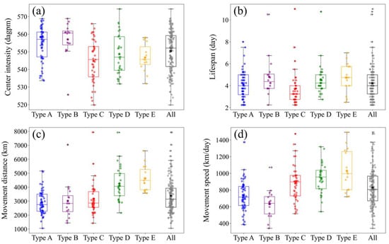 Figure 7 presents the center intensity, lifespan, movement distance, and movement speed across five types of NCCVs. At 500 hPa, the center intensity (Figure 7a) was represented by the average geopotential height of the NCCV center at each time step along its track. The center intensity for all NCCVs averaged about 550 dagpm, with values ranging from 519 to 574 dagpm. Types A and B NCCVs exhibited weaker center intensity values, particularly type B, which had a median of 560 dagpm. In contrast, type C had a stronger center intensity, with an average value below 545 dagpm. The average lifespan (Figure 7b) for all NCCVs was 4.2 days, ranging from 2 days to 11 days. The type C NCCVs had the shortest lifespan, averaging 3.7 days with a median of 3 days, while the other types had an average lifespan of at least 4 days. Specifically, type A averaged 4 days, type D 4.5 days, and types B and E nearly 5 days. For the movement distance (Figure 7c), the average for all NCCVs was 3400 km, with a range from 1000 km to 8000 km. Types A, B, and C exhibited shorter average movement distances of around 3000 km, while type D moved approximately 4200 km and type E covered the longest distance at 4600 km. In terms of movement speed (Figure 7d), the average for all NCCVs was 800 km/day, with a range of 300 km/day to 1500 km/day. Specifically, type E had the fastest speed, then types D and C, while type B was the slowest.