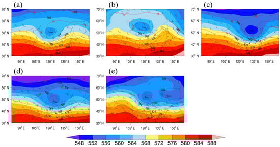 To explain the potential causes of each NCCV track, Figure 8 presents the composite of the 500 hPa atmospheric circulation at the peak time for five types of NCCVs. For type A NCCVs (Figure 8a), the blocking high (BH) over the Sea of Okhotsk hindered their progression, resulting in a short distance movement, slow speed, and dissipation over Northeast China. For type B (Figure 8b), the BH was stronger and positioned farther northwest than in type A, often causing retrogression after eastward movement (Figure 4b), resulting in the slowest speed and the smallest activity range. The differences in the position and intensity of the BH over the Sea of Okhotsk led to distinct tracks for types A and B. For type C (Figure 8c), the Eastern Siberian region was characterized by an obvious low-pressure system, with the strongest center intensity. Without the BH over the Sea of Okhotsk, the type C NCCVs moved eastward into the ocean at high speed and within a short duration. Influenced by the weak blocking high over Lake Baikal and the Sea of Okhotsk (Figure 8d), type D showed long-distance eastward movement. In contrast, type E (Figure 8e) was associated with the strong BH over Lake Baikal and the low-pressure system over the Sea of Okhotsk, leading to a distinct northwest–southeast direction and the fastest speed. The circulation patterns of these different NCCV track types, particularly their association with BH systems, are largely consistent with the five categories classified by Zhou et al. [30] based on the shape of NCCVs.