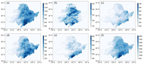 During the warm season from 2012 to 2022, the NCCVs occurred for 663 days, accounting for 40% of the whole warm season. The distribution of the accumulated precipitation during all NCCV occurrence days (Figure 9f) exhibits a southeast-to-northwest decreasing trend, with the southeastern Liaoning Province marked as the center of heavy precipitation, as previously demonstrated by Huang and Cui [42]. The spatial distributions of the accumulated precipitation in Northeast China, influenced by different NCCV tracks, varied notably, particularly for types A, B, and C. The accumulated precipitation induced by type A NCCVs, which lasted for 230 active days, featured two precipitation centers located in the southeastern Liaoning Province and central Heilongjiang Province. The type B NCCVs (77 days) triggered heavy precipitation in central Northeast China. The type C NCCVs (152 days) rarely caused heavy precipitation but type D (133 days) triggered the distinct rain belt across eastern Northeast China. The precipitation induced by type E (77 days) was concentrated in southeastern Liaoning Province.