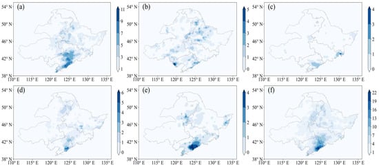 As shown by the spatial distribution of cold vortex (CV) rainstorms (≥50 mm/24 h; Figure 10), the southeastern Liaoning Province was a typical high-frequency CV rainstorm area, with up to 24 rainstorm days occurring in the same region. The second-highest frequency occurred along the border between Inner Mongolia and Heilongjiang Province. Influenced by the type A NCCVs, CV rainstorms occurred most frequently in the southeastern Liaoning Province and the southern Jilin Province, with a maximum of 11 rainstorm days. Under the influence of type C NCCVs, CV rainstorms were rare. On the occurrence day of type E NCCVs, the CV rainstorms remained concentrated in the southeastern Liaoning Province.