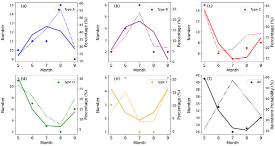 Monthly variations of NCCVs: (a) type A, (b) type B, (c) type C, (d) type D, (e) type E, and (f) all NCCVs. Scatter point represents the quantity, dashed line represents the proportion, and solid line represents the trend.