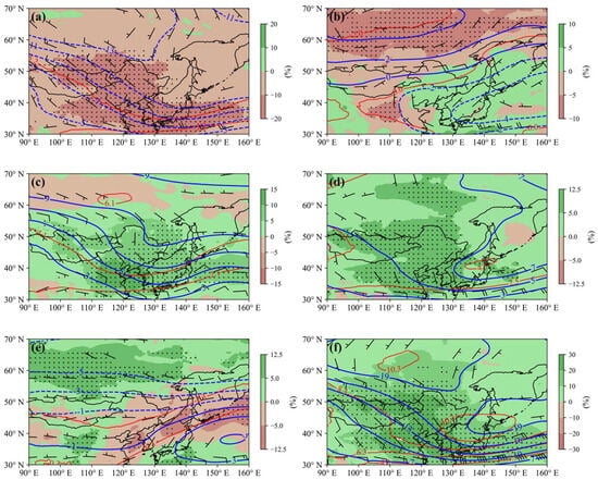To further investigate the inter-monthly variations in the tracks of NCCVs during the warm season, Figure 12 reflects the geopotential height and temperature deviations at 500 hPa, as well as the relative humidity deviation at 850 hPa for each month relative to the average of the whole warm season. In May (Figure 12a), the noticeable negative potential height deviation occurred over Central Siberia, Northeast China, and the Sea of Okhotsk, with the prevalence of northwest winds favoring the formation of NCCVs of types C, D, and E. The humidity at 850 hPa was relatively weak, and the possibility of precipitation was minimal. From June to August (Figure 12b–d), the potential height deviation over Northeast China and the Sea of Okhotsk gradually shifted from negative to positive, accompanied by a positive temperature anomaly. Thus, the BH over the Sea of Okhotsk was strengthened, hindering the eastward movement of the NCCV [43] and favoring the formation of types A and B. Additionally, the wind over Northeast China shifted from northerly to southerly, and the lower-level humidity increased, contributing to precipitation events. The deviations for August relative to May (Figure 12f) more clearly illustrated the adjustment of the circulation pattern. In September (Figure 12e), the subtropical high moved southward, and Northeast China and the Sea of Okhotsk gradually came under the influence of a low-pressure system, promoting the formation of other types of NCCVs. Additionally, the lower-troposphere humidity decreased, coupling with the westerly wind, leading to reduced precipitation.
