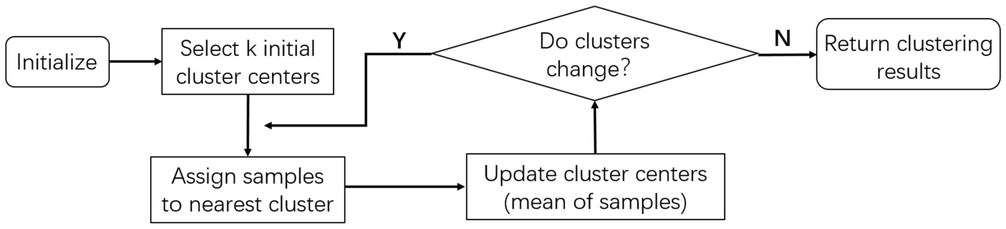 The K-means clustering algorithm clusters samples by measuring their similarity, dividing them into K clusters while ensuring that each sample belongs exclusively to one cluster. This algorithm maximizes inter-cluster distances and minimizes intra-cluster distances. With high computational efficiency and ease of implementation, the K-means clustering algorithm has been widely applied in the classification research of vortex systems through selecting specific feature parameters (i.e., centroid and variances). A conceptual graph of the K-means clustering algorithm is illustrated in Figure 1.