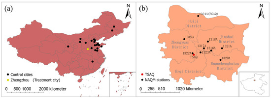 The geographic location of (a) the cities within the control and treatment groups and (b) the monitoring stations in Zhengzhou, with the lower right corner indicating the location of Zhengzhou’s urban area within Henan Province. Nine national air quality monitoring (NAQM) stations are situated in different districts of Zhengzhou, comprising eight urban stations and one background station 1314A for air quality monitoring (BSAQ). The traffic station for air quality monitoring (TSAQ) is a municipal monitoring station located at the intersection of Longhai Road and Qinling Road.