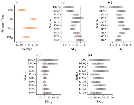 The percentage difference (%) between the observed pollutant concentrations and the business-as-usual (BAU) conditions at the traffic station for air quality monitoring (TSAQ), background station for air quality monitoring (BSAQ), and the other urban stations during the event policy window in Zhengzhou: (a) mean values of monitoring stations; (b) NO2; (c) O3; (d) PM2.5; (e) PM10. Negative values indicate that the control measures lead to a decrease in pollutant concentrations, resulting in an improvement in air quality. The points represent the mean percentage difference during the NMG period, with the bars indicating the upper and lower bounds of the percentage change.