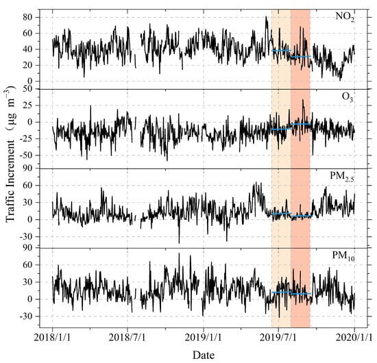 The traffic increments of weather-normalised NO2, O3, PM2.5, and PM10 in Zhengzhou from 2018 to 2019. Two shaded areas represent two periods for comparison of pollutant concentrations: (1) Pre-NMG, from 15 June 2019 to 31 July 2019, and (2) During-NMG, from 1 August 2019 to 16 September 2019. The blue lines represent the mean traffic increments of the two periods, respectively.