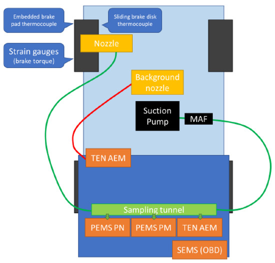 Various measurement devices were connected to the tunnel, including a PEMS particle mass counter (PEMS PM), a PEMS particle number counter (PEMS PN) and a TEN PN particle counter. Additionally, a TEN particle number counter was connected to a small sampling nozzle placed upstream of the braking system to capture background particle levels and eliminate instances of external high emissions sources from the data. Because of the positioning of the background nozzle, it is emphasised that this signal could not be used (and was not used) to determine the background particle levels at the brake in between braking events. The entire setup was linked to the vehicle via a standardised OBD connector, enabling data extraction and logging on a SEMS device.