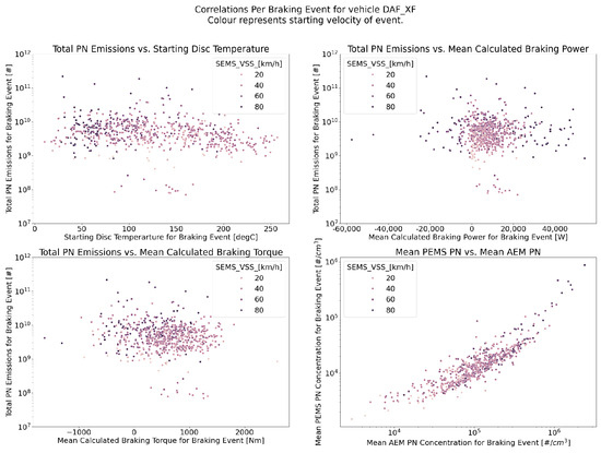 A correlation analysis was also performed to investigate the relationship between different measured and calculated variables, including PN emissions, the starting disc temperature, and the average calculated braking force and power per braking event, both before and after applying the selection cuts. The results are presented in Figure 3 and Figure 4. Notably, before filtering the data, no clear evidence of correlations was observed between the PN emissions and the other variables. This lack of correlation was likely due to the sensitivity of the measurement setup to vibrations from the brake calliper and frame during the on-road measurements. A good correlation was only found between the PEMS PN and TEN AEM concentration signals, which effectively cross-validated the PN outputs of both machines.